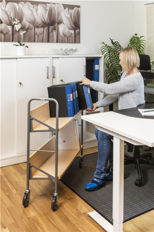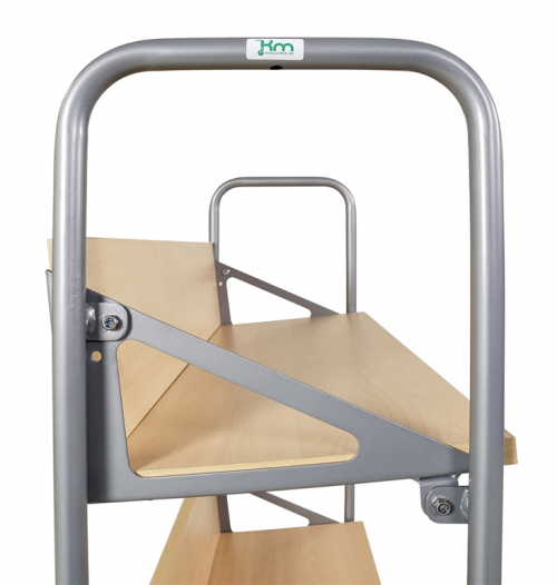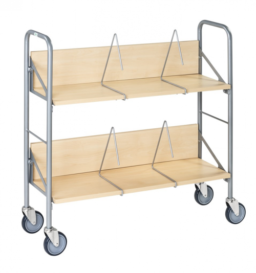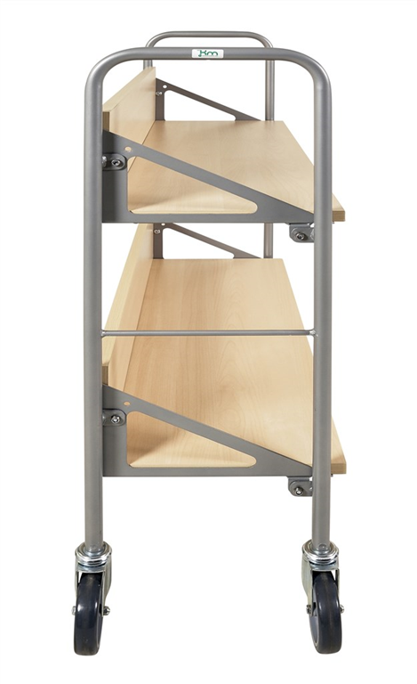 En pärmvagn med 2 sneda hyllplan i björkmelamin. Pulverlackerad grå ram. Pärmvagnen är lätt att manövrera och kan enkelt rullas fram och tillbaka efter behov. Levereras med 4 bokstöd.